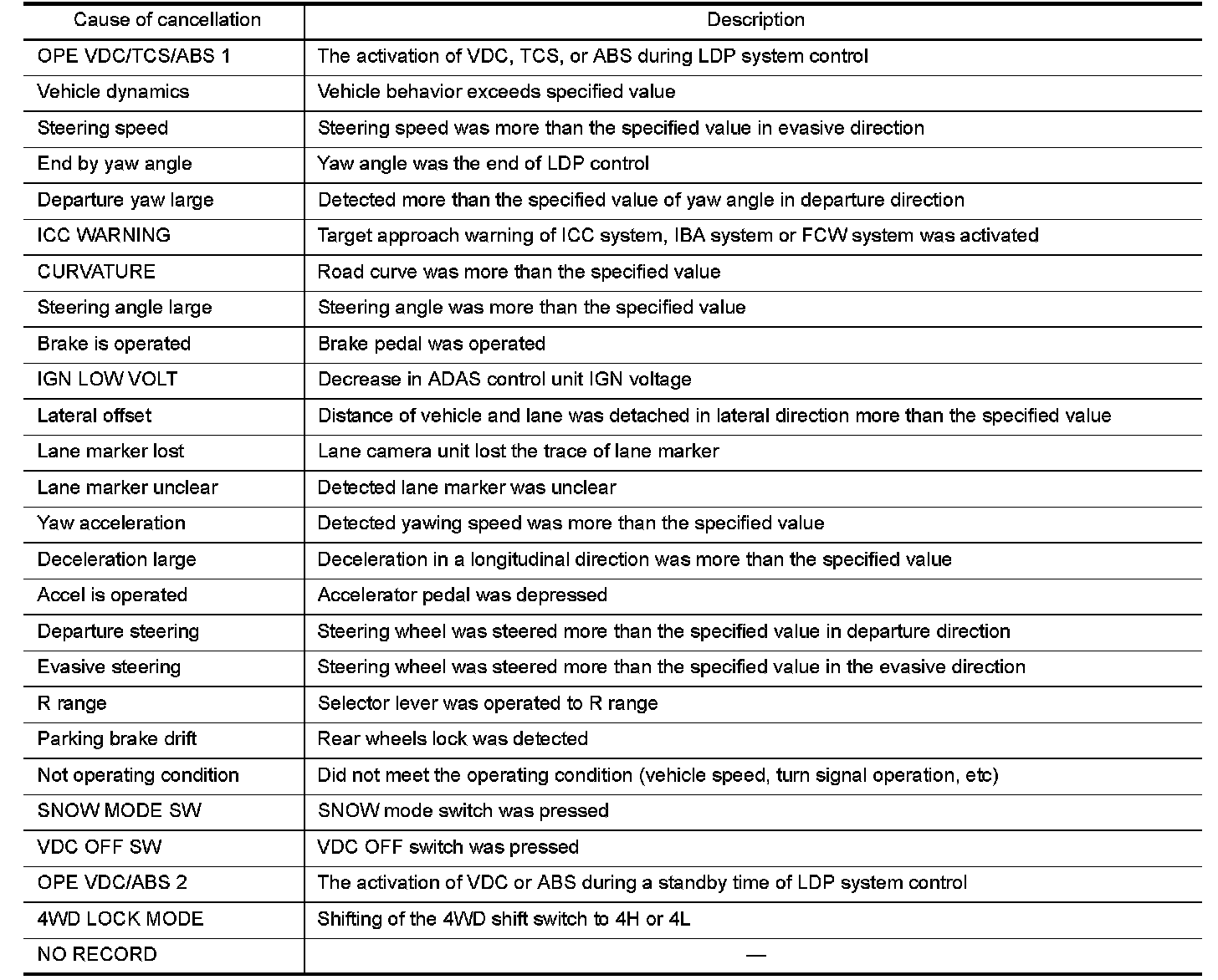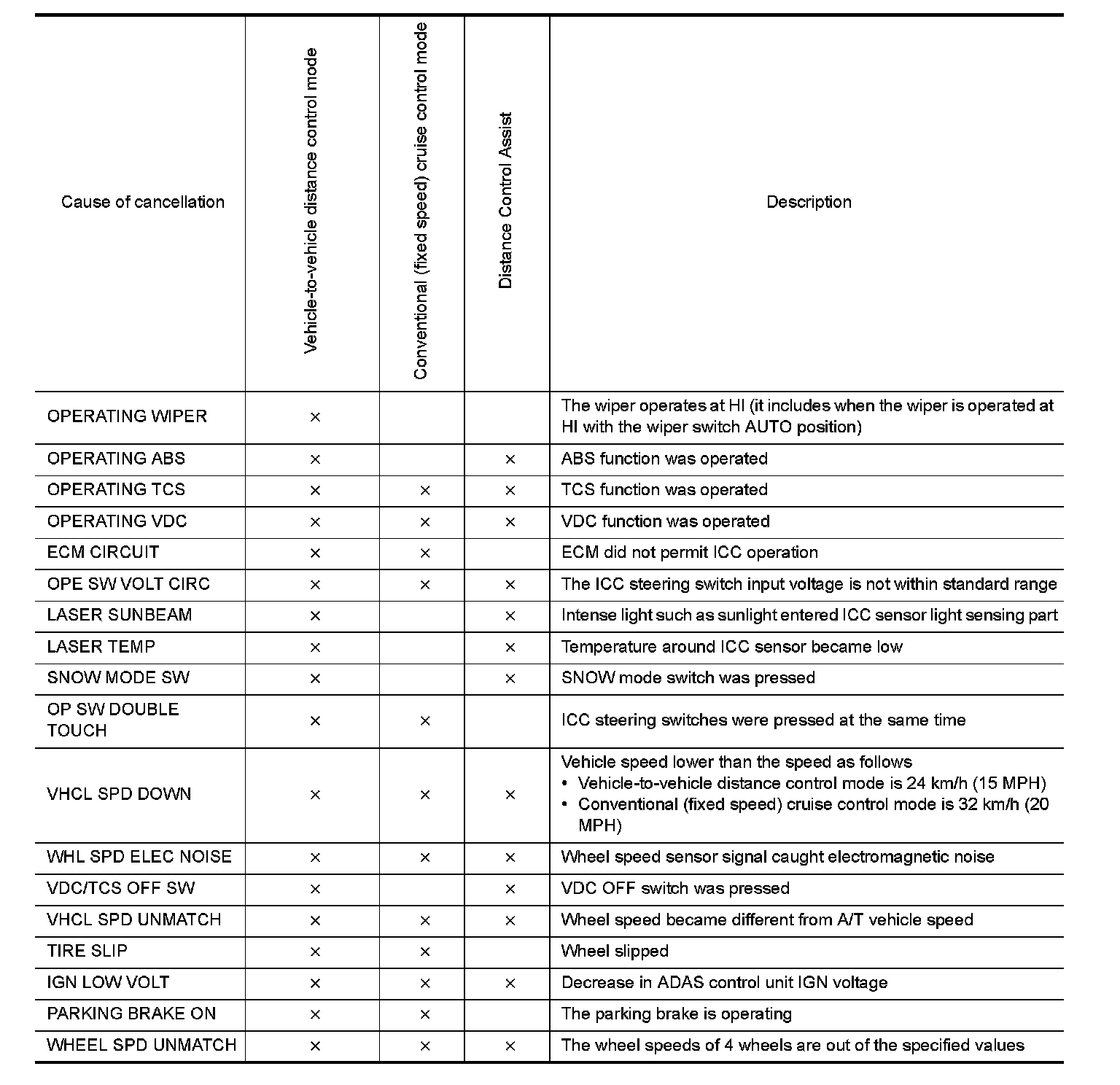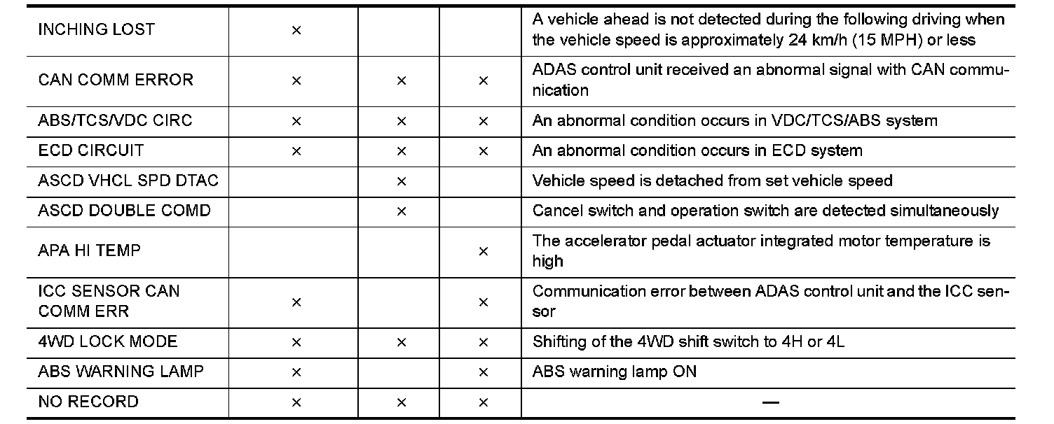 - The displayed cancellation causes display the number of the ignition switch ON/OFF up to 254. It is fixed to 254 if it is over 254. It returns to 0 when the same cancellation cause is detected again.