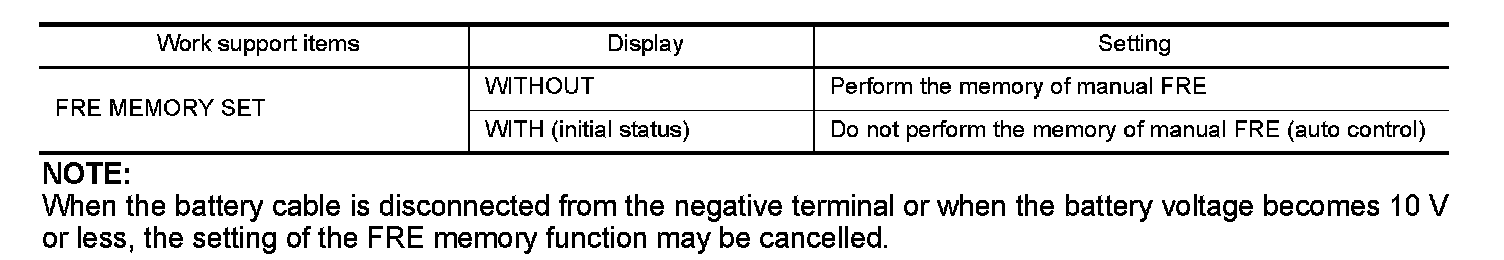 When the battery cable is disconnected from the negative terminal or when the battery voltage becomes 10 V or less, the setting of the FRE memory function may be cancelled.
