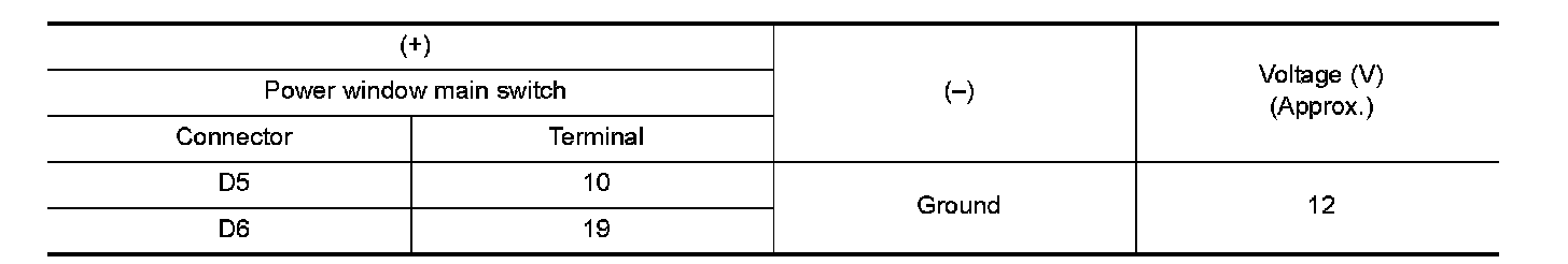 4. Check voltage between power window main switch harness connector and ground.