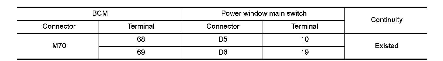 3. Check continuity between BCM harness connector and power window main switch harness connector.