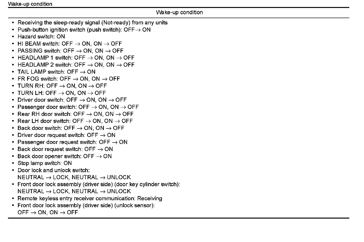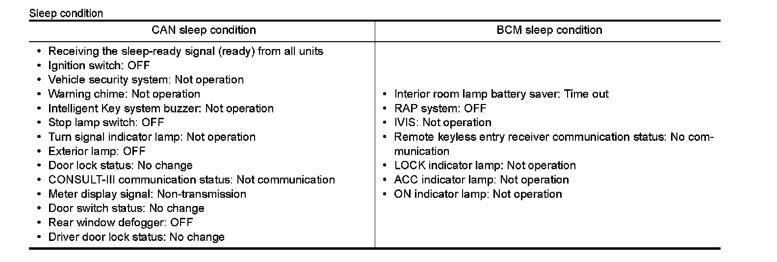 - BCM transmits the sleep wake up signal (sleep) to each unit when all of the CAN sleep conditions are fulfilled.