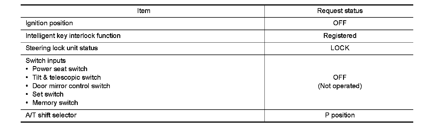 - In standby status, when ignition switch is operated from OFF to ACC, return operation sets seat sliding and steering column tilt to a registered position.