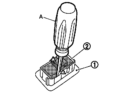 2. Press pawls and remove seat memory switch (2) from front door garnish (1), with flat-bladed screw driver (A).