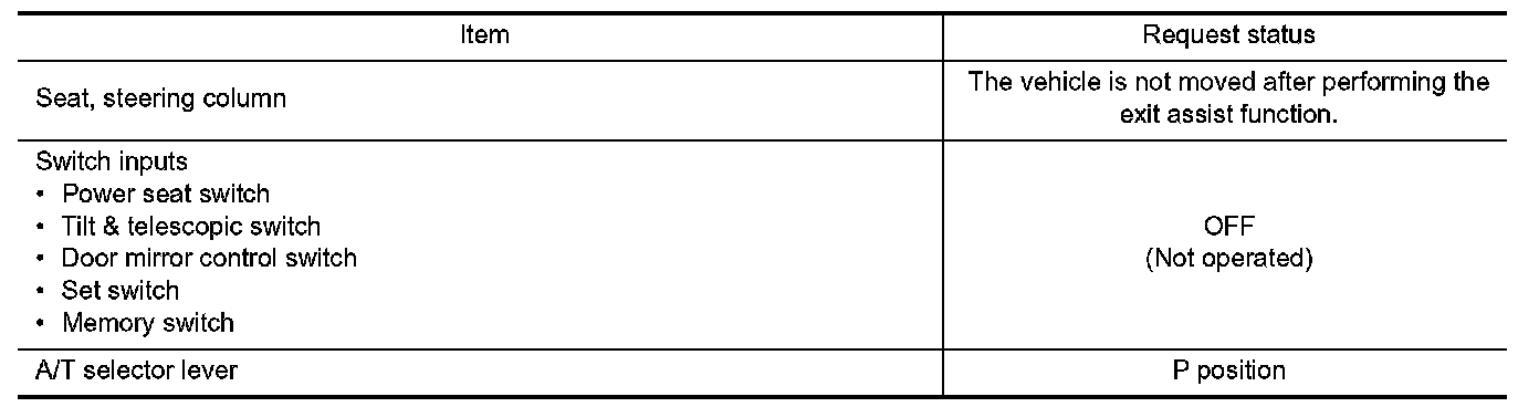 Satisfy all of the following items. The entry assist function is not performed if these items are not satisfied.
