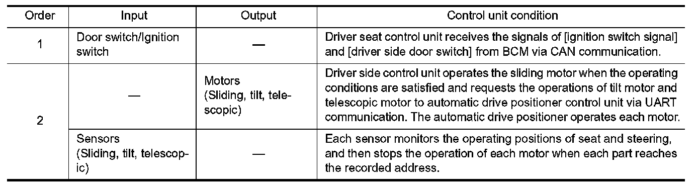 2.Driver seat and steering column will return from the exiting position to entry position.