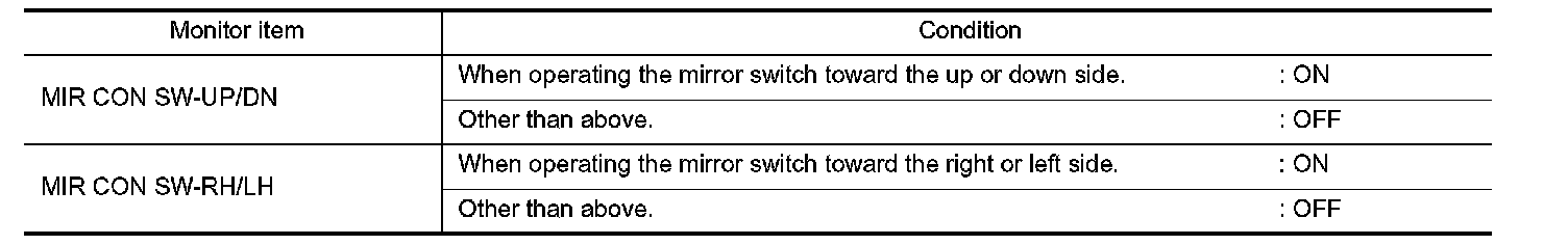Check the operation on "MIR CON SW-UP/DN" and "MIR CON SW-RH/LH" in "DATA MONITOR" mode with CONSULT.