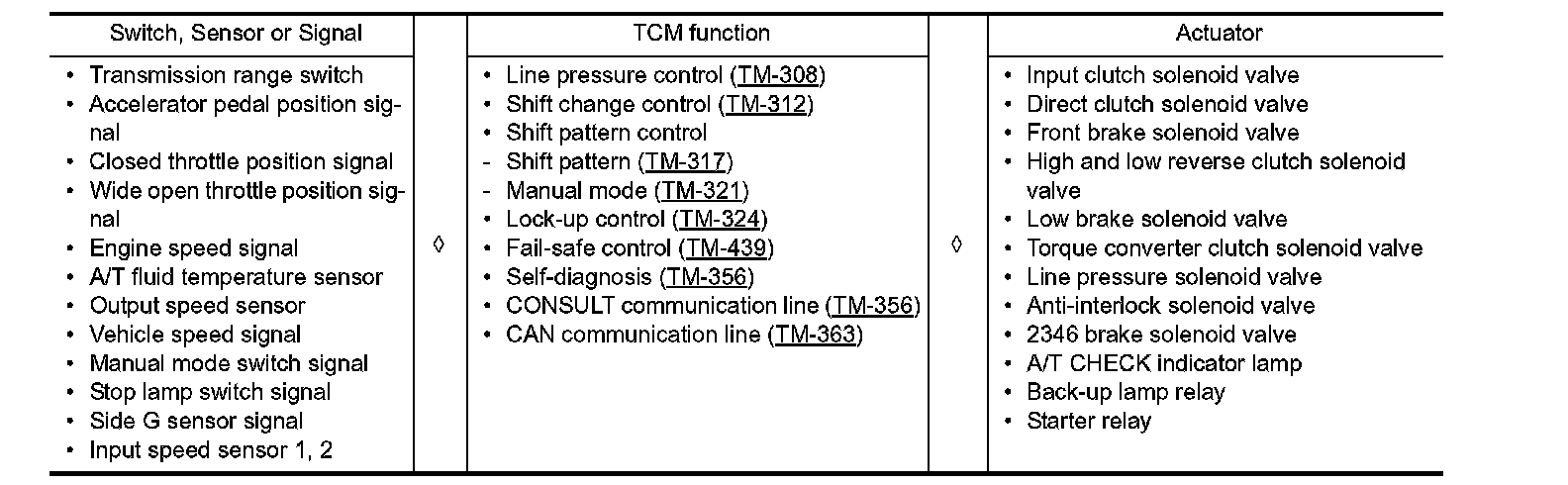 - The A/T senses vehicle operating conditions through various sensors or signals. It always controls the optimum shift position and reduces shifting and lock-up shocks.