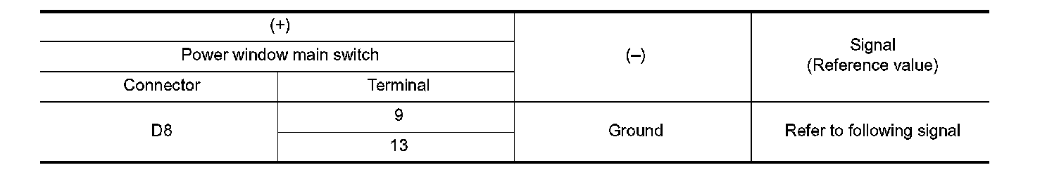 2.Check signal between power window main switch harness connector and ground with oscilloscope.