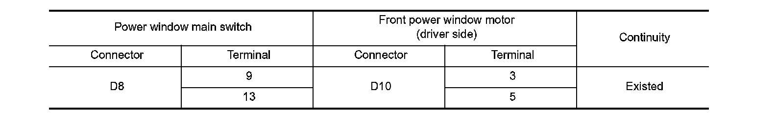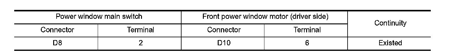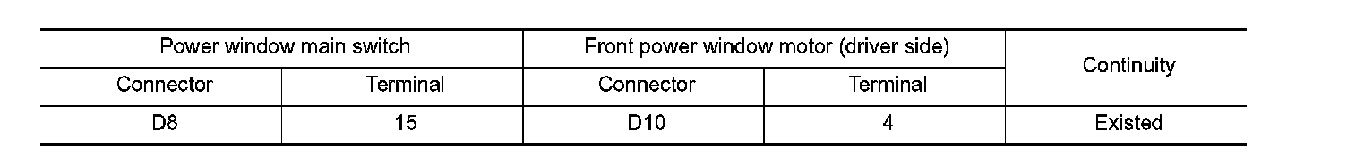 2.Check continuity between power window main switch harness connector and front power window motor (driver side) harness connector.