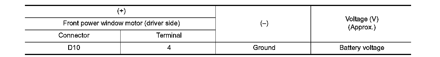 3.Check voltage between front power window motor (driver side) harness connector and ground.
