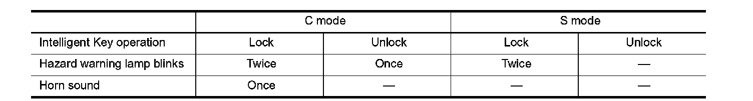 When LOCK and UNLOCK signals are sent from the Intelligent Key for more than 2 seconds at the same time, the hazard and horn reminder mode is changed and hazard warning lamp blinks and horn sounds as per the following items: