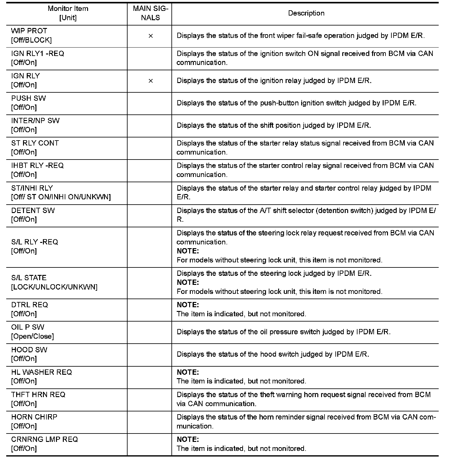 The following table includes information (items) inapplicable to this vehicle. For information (items) applicable to this vehicle, refer to CONSULT display items.