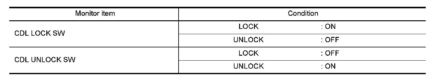 Check ("CDL LOCK SW ", "CDL UNLOCK SW") in "DATA MONITOR" mode for "POWER DOOR LOCK SYSTEM" with CONSULT. Refer to"DOOR LOCK : CONSULT Function (BCM DOOR LOCK)" CONSULT Function.