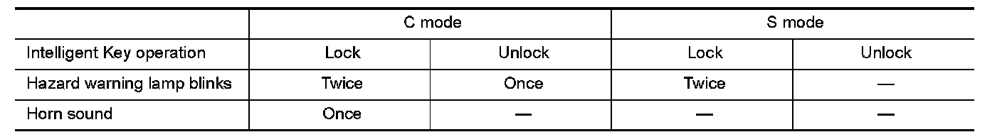 When LOCK and UNLOCK signals are sent from the Intelligent Key for more than 2 seconds at the same time, the hazard and horn reminder mode is changed and hazard warning lamp blinks and horn sounds as per the following items: