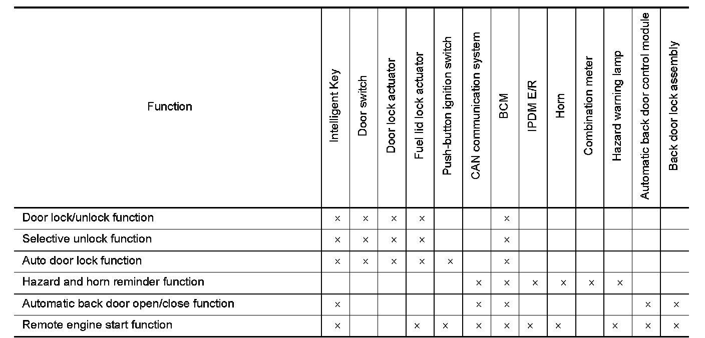 - Then, if an UNLOCK signal is transmitted from Intelligent Key again within 60 seconds, all other doors (except for back door) are unlocked.