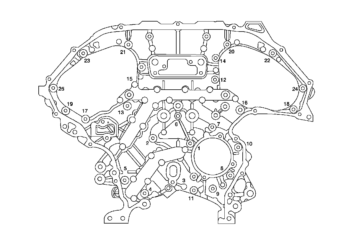 Tighten the front timing chain case bolts in the order shown.
