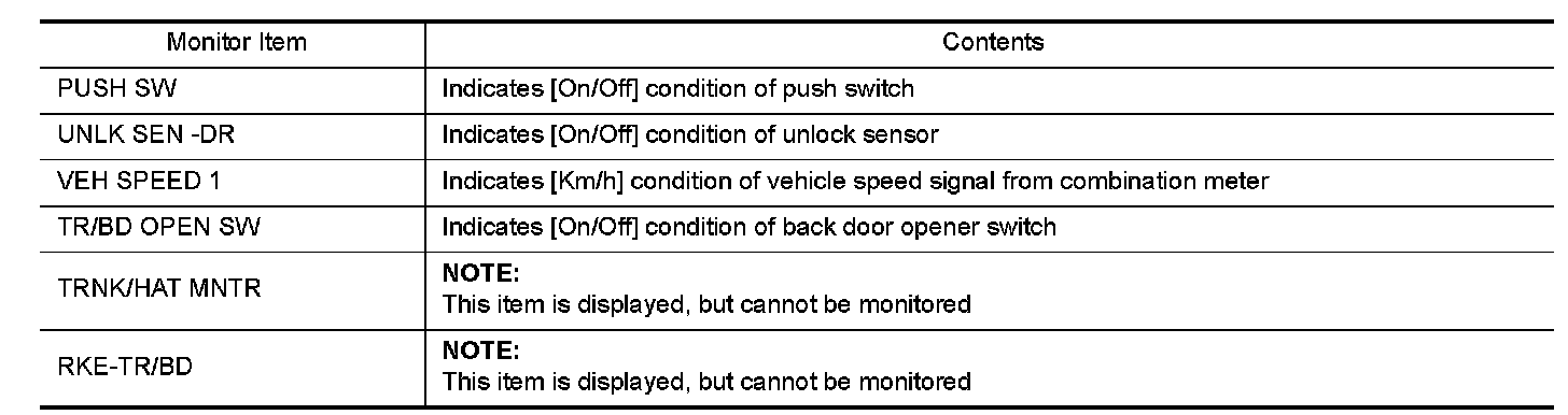 The following table includes information (items) inapplicable to this vehicle. For information (items) applicable to this vehicle, refer to CONSULT display items.