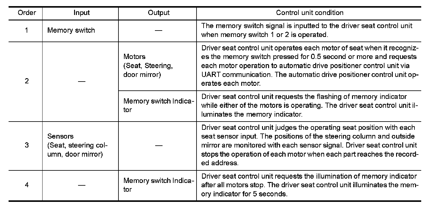 - The memory function can be performed for 45 seconds after opening the driver door even if the ignition switch position is in OFF position.