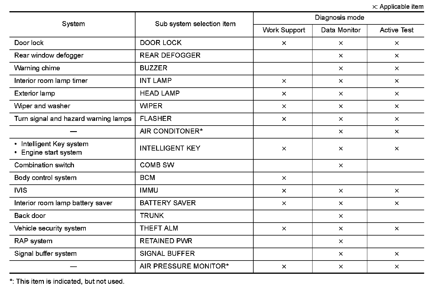 It can perform the diagnosis modes except the following for all sub system selection items.