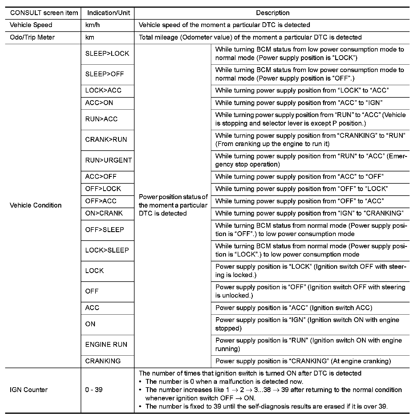 The BCM records the following vehicle condition at the time a particular DTC is detected, and displays on