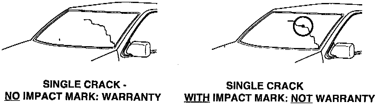 1. Single crack beginning or ending at the edge of the glass: A magnifying glass may be needed since the impact marks can be less than 1 mm in diameter. If an impact mark is found anywhere along the crack, it indicates the damage was done due to an impact to the glass. This is not covered under Infiniti's warranty and is the customer's responsibility. If no impact mark is found, it 5 covered under warranty.