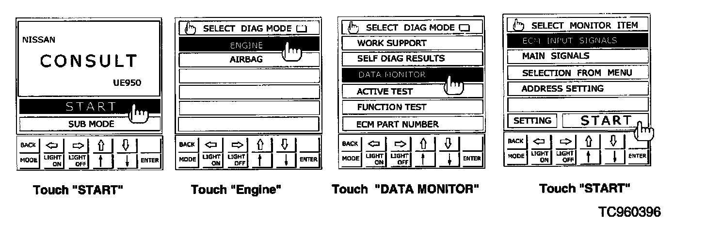 Monitor the idle speed (CM PS.RPM) on the CONSULT screen.