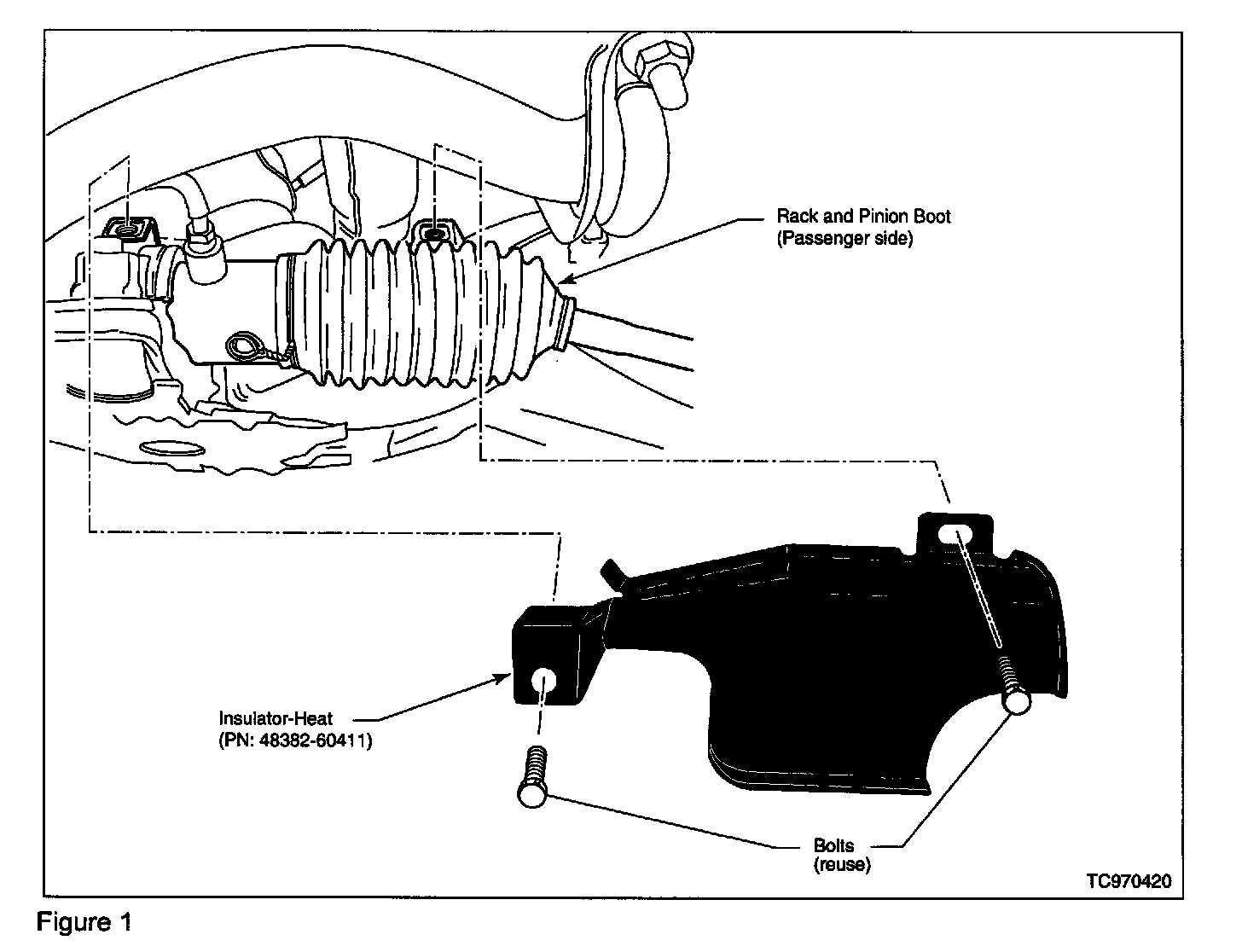 1990-1996: Install the countermeasure starter motor assembly and power steering heat insulator (see Parts Information on page 5). Refer to the appropriate service manual (EL section) for installing the starter motor. Refer to Figure 1 for installing the power steering heat insulator.