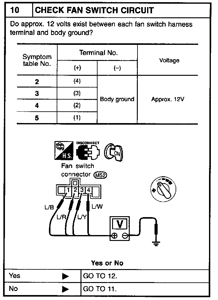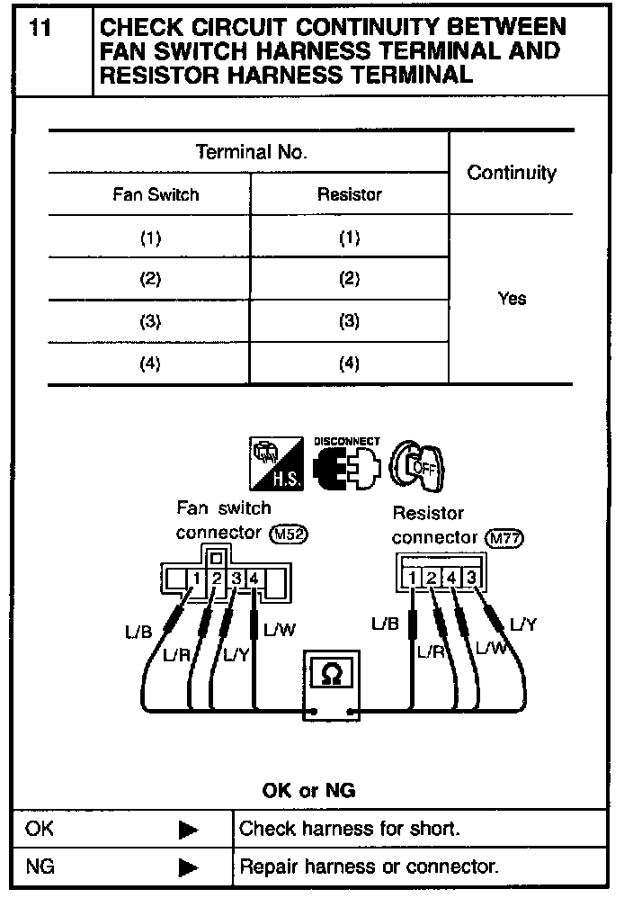 11. Check Circuit Continuity Between Fan Switch Harness Terminal And Resistor Harness Terminal