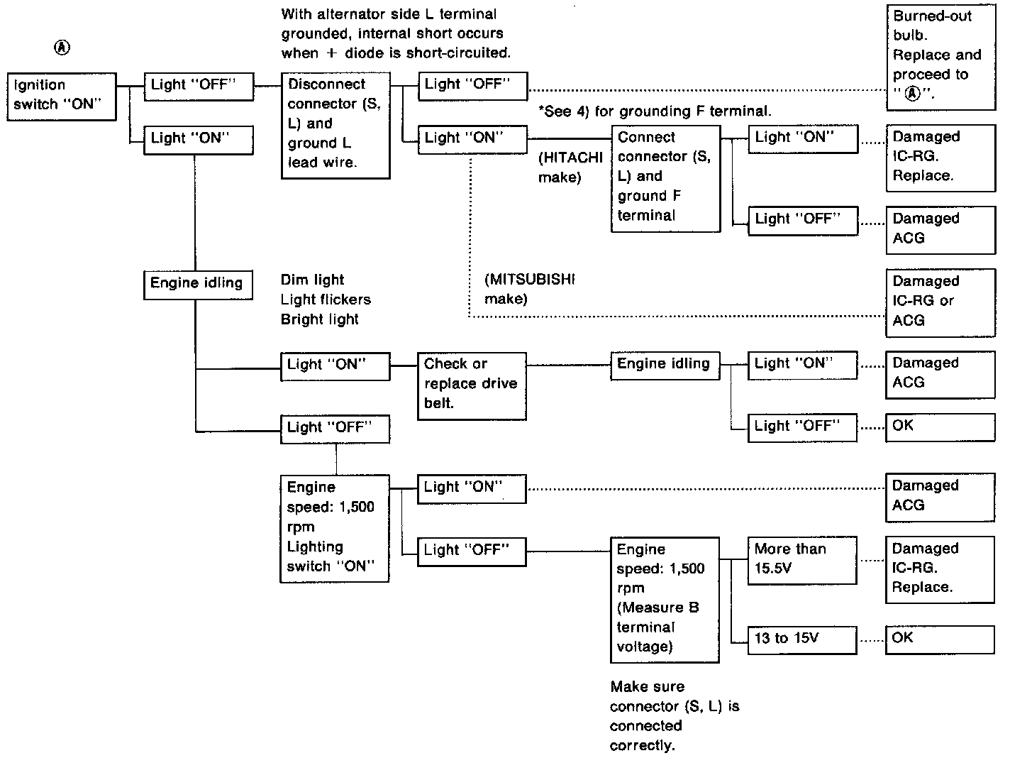 3. If "Damaged ACG", remove alternator from vehicle disassemble, inspect and correct or replace faulty parts.
