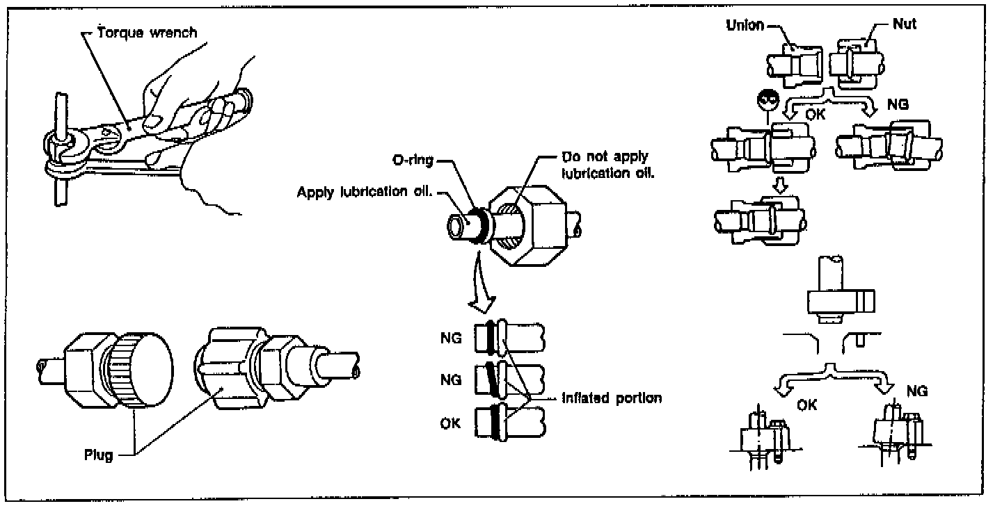 ^ After connecting line, conduct leak test and make sure that there is no leakage from connections. When the gas leaking point Is found, disconnect that line and replace the O-ring. Then tighten connections of seal seat to the specified torque.