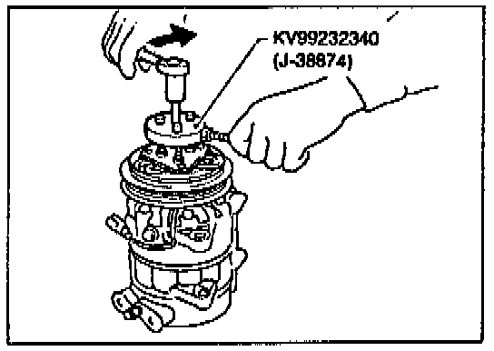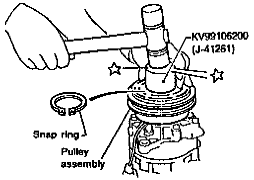 ^ Install the pulley assembly using the installer and a hand press. and then install the snap ring using snap ring pliers