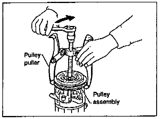 To prevent the pulley groove from being deformed, the puller claws should be positioned onto the edge of the pulley assembly.