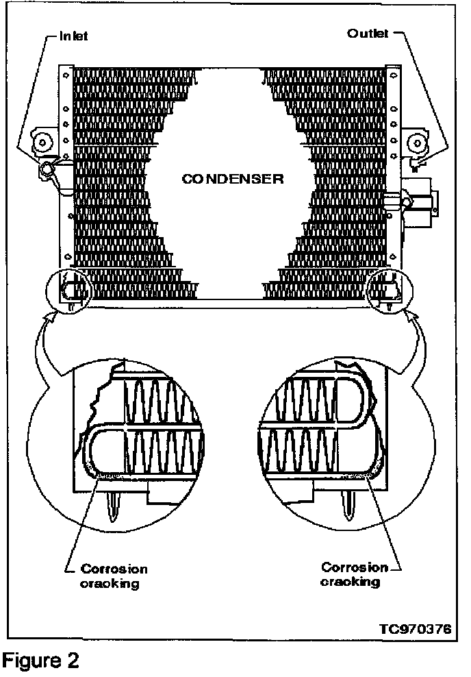 If a 1991-93 G20 (below VIN # 450021) exhibits refrigerant leaking from the condenser serpentine tube, this condition may be caused by a corrosion crack in the condenser serpentine tube located at the contact area between the tube and the side support (see Figure 2).