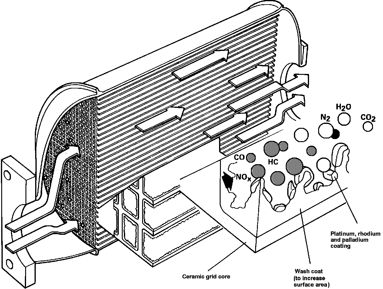 The catalytic converter is an emission control device added to the exhaust system to reduce hydrocarbons (HC), carbon monoxide (CO) and oxides of nitrogen (NOx) emissions. The converter incorporates a honeycomb mesh coated with three catalysts (platinum, rhodium and palladium). The catalytic material promotes burning (oxidation) of the pollutants as the gases pass through the converter. The gases are transformed into non-polluting gases H20 (water) and CO2 (carbon dioxide).