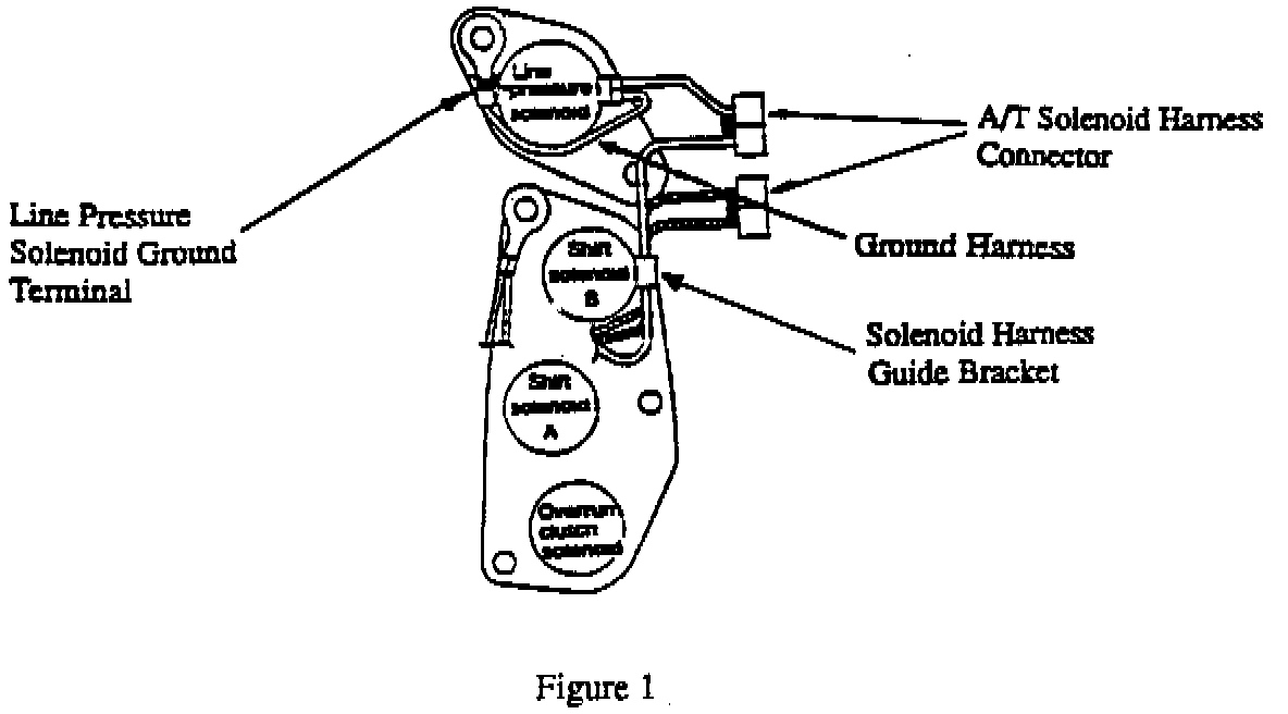 ^ Solenoid Harness guide bracket: Inspect the solenoid harness wires passing through the guide bracket (attached to shift solenoid "B"). The guide bracket (Figure 1) may cut the wires for the shift solenoids, causing poor or improper continuity.