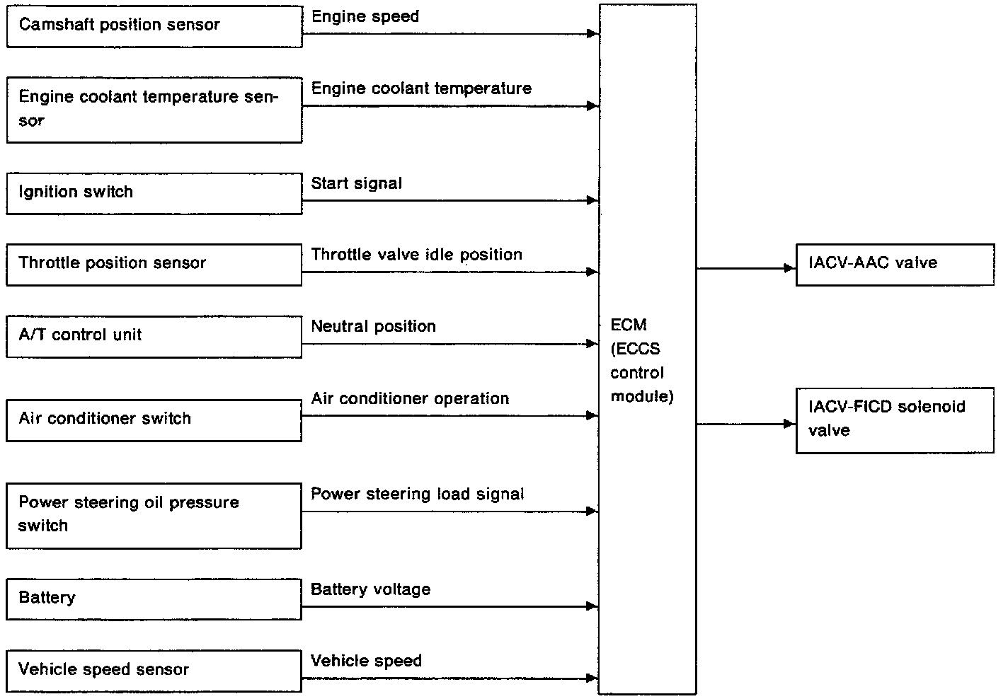 This system automatically controls engine idle speed to a specified level. Idle speed is controlled through fine adjustment of the amount of air which by-passes the throttle valve via IACV-AAC valve. The IACV-AAC valve repeats ON/OFF operation according to the signal sent from the ECM. The camshaft position sensor detects the actual engine speed and sends a signal to the ECM. Then, the ECM controls the ON/OFF time of the IACV-AAC valve so that engine speed coincides with the target value memorized in ECM. The target engine speed is the lowest speed at which the engine can operate steadily. The optimum value stored in the ECM is determined by considering various engine conditions. Such conditions include noise and vibration transmitted to the vehicle interior, fuel consumption, and engine load.