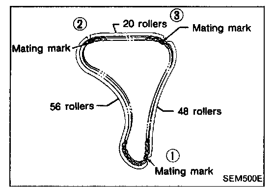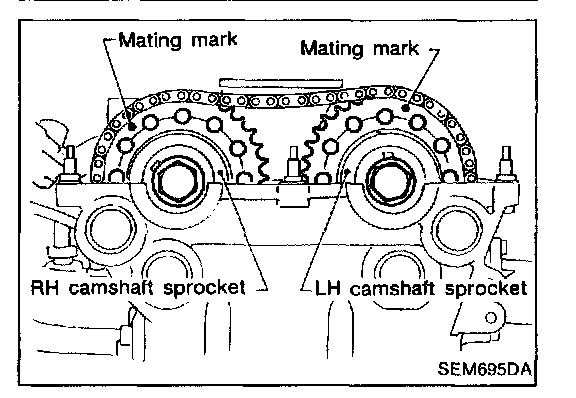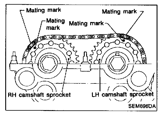Rotate crankshaft until mating mark on camshaft sprocket is set at position indicated in figure at left.