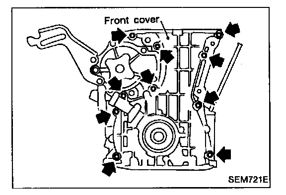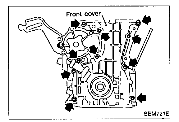 4. Before installing front cover, remove all traces of liquid gasket from mating surface using a scraper.