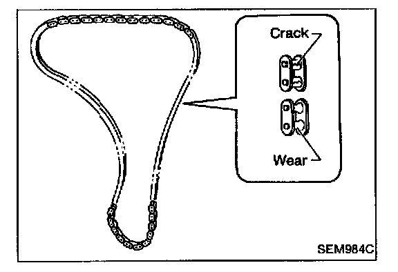 Check for cracks and excessive wear at roller links. Replace chain If necessary.