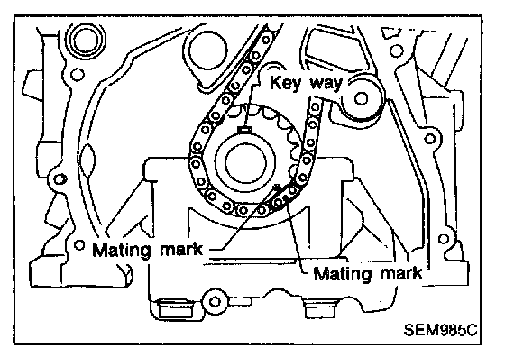 2. Position crankshaft so that No.1 piston is set at TDC (Key way at 12 o'clock, and mating mark at 4 o'clock approximately). Fit timing chain to crankshaft sprocket, with its mating mark in line with crankshaft sprocket mating mark.