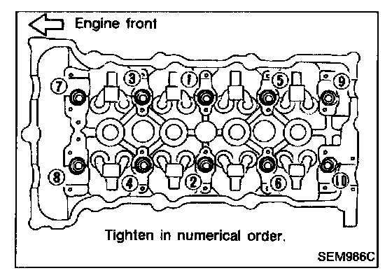 LH camshaft: Tighten bolts 11 - 12 In that order then tighten bolts 1 - 10 in that order. 2 Nm (0.2 kg-m, 17 in-lb)
