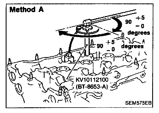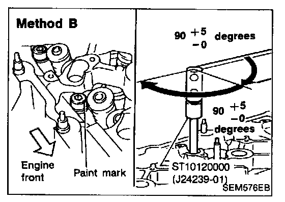 Method B: If angle wrench is not available, do the following. Mark the side of all bolts with paint marks facing the front of the engine. Then turn them 90 ±5° clockwise.
