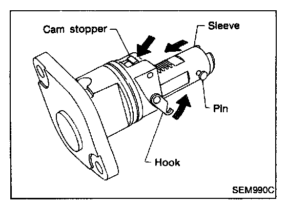 Make sure the camshaft sprockets are tightened completely. Press cam stopper down and "press-In" sleeve until hook can be engaged on pin. When tensioner Is bolted In position the hook will release automatically. Ensure arrow "A" faces the front of the engine.