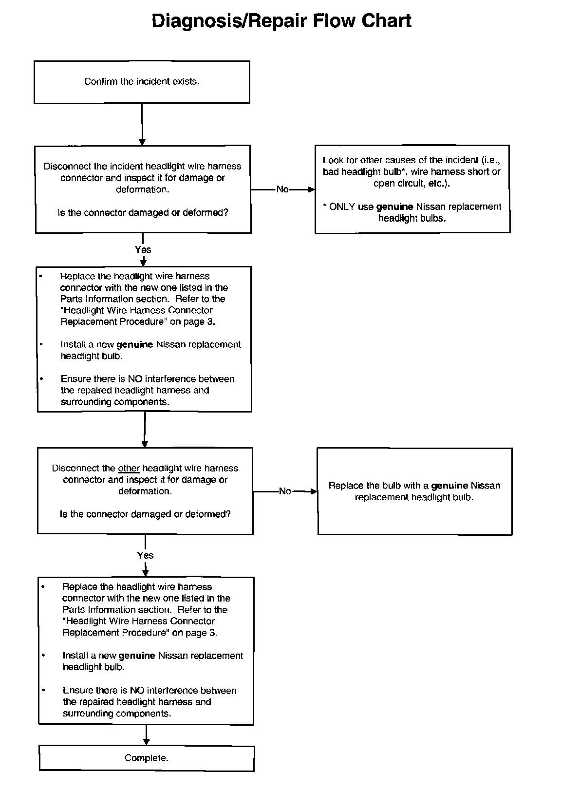 Infiniti has established replacement headlight connectors and service procedures to replace damaged connectors on the applied vehicles. If the headlight wire harness connector is damaged, causing intermittent or improper headlight operation, or the connector otherwise needs replacement, follow the procedures in this bulletin.