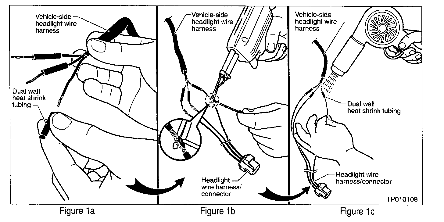 5. Slide a one-inch piece of dual-wall heat shrink tubing (3M(TM) P/N 054007-55917 or equivalent) onto each wire of the vehicle wire harness (see Figure 1a).