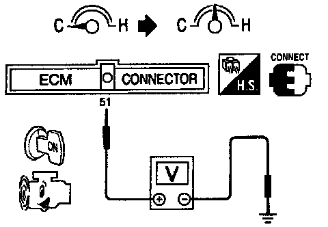 2) Probe voltage meter between Engine Control Module (ECM) terminal (51) and ground.
