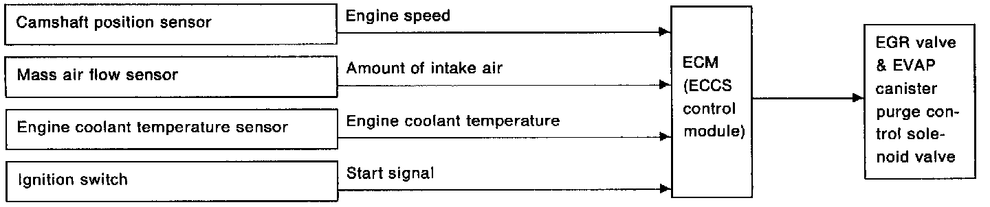 This system cuts and controls vacuum applied to the Exhaust Gas Recirculation (EGR) valve and EVAP canister to suit engine operating conditions. This cut-and-control operation is accomplished through the Engine Control Module (ECM) and the EGR valve & EVAP canister purge control solenoid valve. When the ECM detects any of the following conditions, current flows through the solenoid valve. This causes the port vacuum to be discharged into the atmosphere. The EGR valve and EVAP canister remain closed.