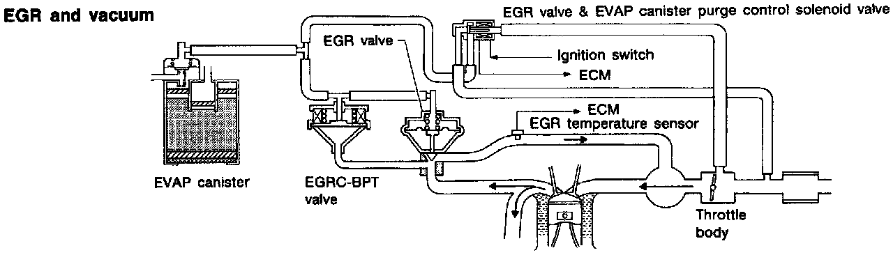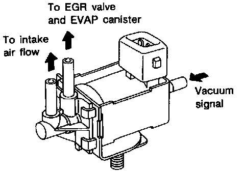 The EGR valve and EVAP canister purge control solenoid valve responds to signals from the ECM. When the ECM sends an ON (ground) signal, the coil in the solenoid valve is energized. A plunger will then move to cut the vacuum signal (from the throttle body to the EGR valve and EVAP canister purge valve).