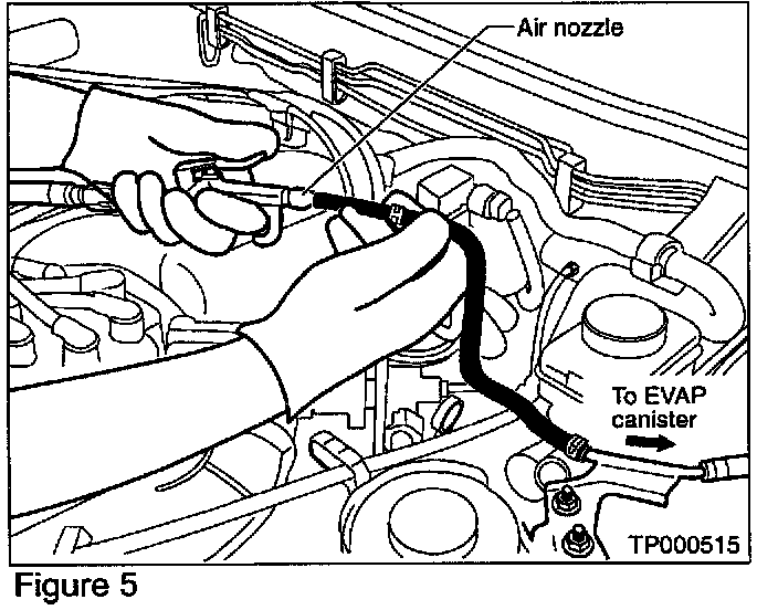 A. Working at the front of the vehicle, blow air through the hose (disconnected in step 3) that leads to the EVAP canister (see Figure 5).