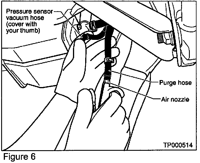 B. Cover the EVAP System Pressure Sensor hose with your finger, then blow air through the Purge hose/EVAP system piping to remove charcoal particles (see Figure 6).